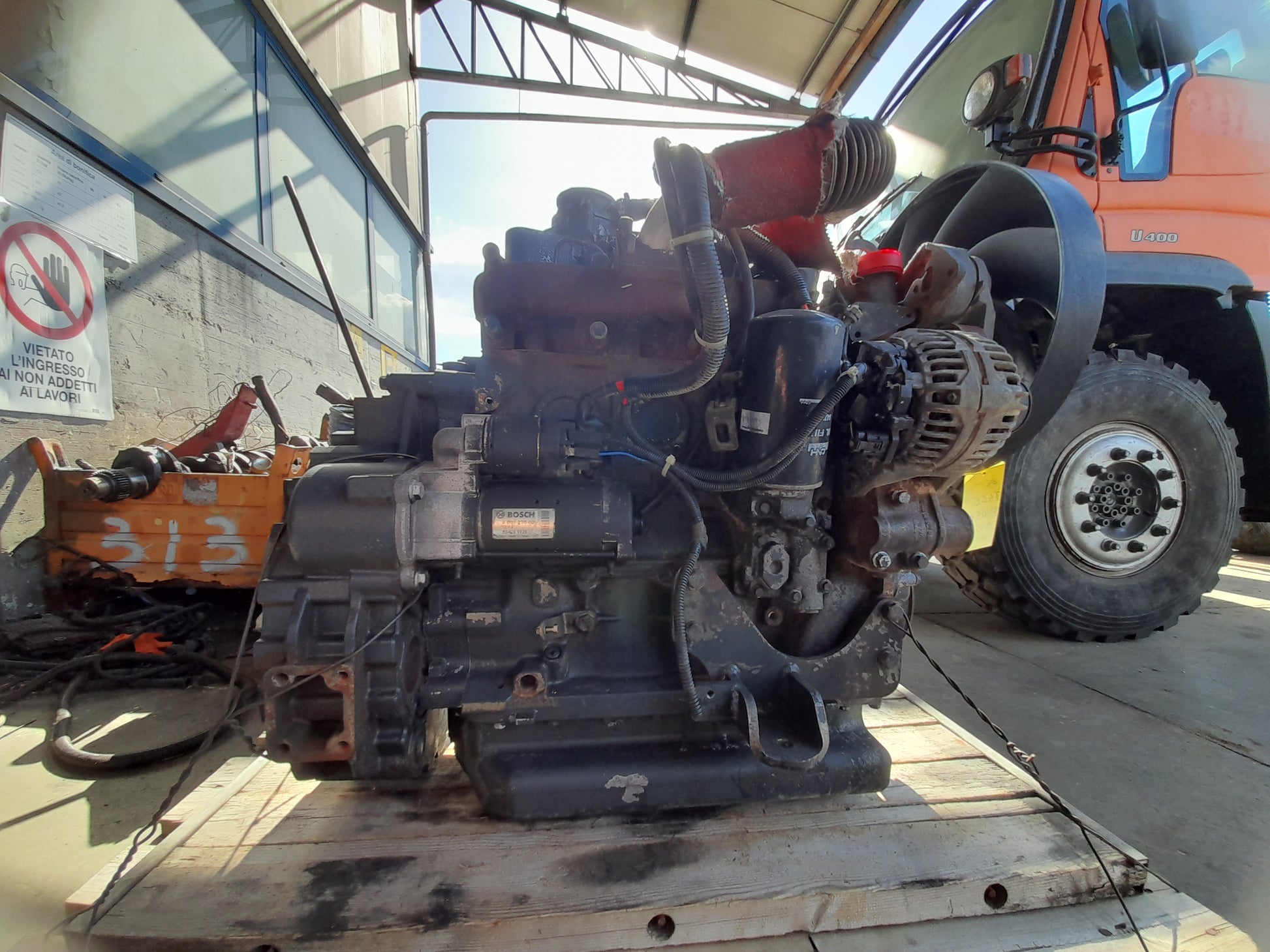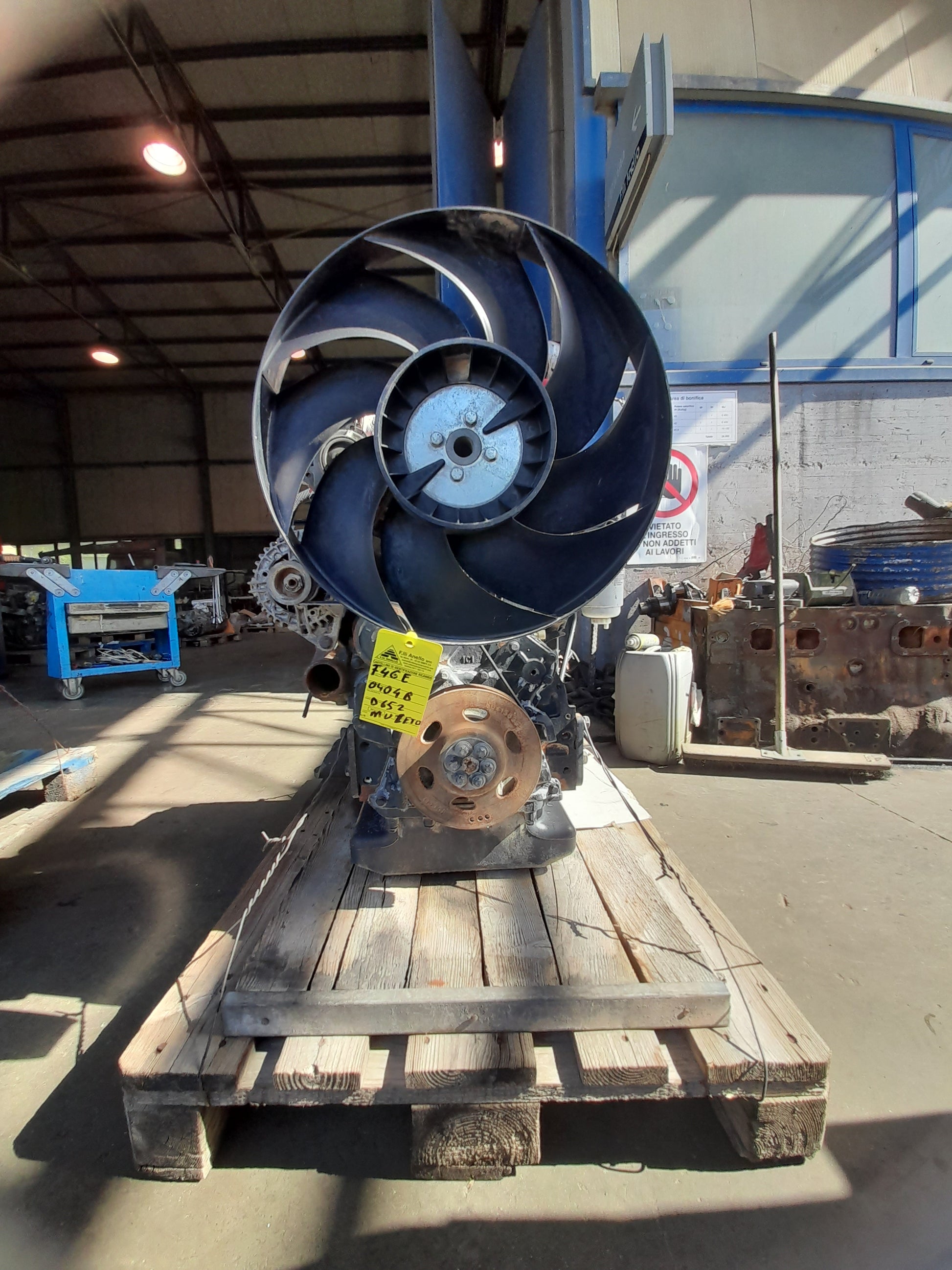 Motore diesel usato in eccellenti condizioni IVECO - NEF - FPT - CNH (KOMATSU 4D104E-2 - HYUNDAI N-SERIES) F4GE0404B*D652 TIER III. Cilindrata 4.480 C.C., 4 cilindri in linea, potenza netta al volano 82 CV - 60.3kW, alesaggio 104 mm - corsa 132 mm, lunghezza 1.200 mm, larghezza 800 mm, altezza 1.000 mm, peso totale 450 kg. L'Iveco /FPT /CNH è una serie di motori diesel che vanno da 4 a 6 cilindri, disponibili in molteplici varianti identificate da codici: A, B, C, F, G, H, 8, 5, 0, 4 modificando potenza, struttura, inquinamento e sistema di iniezione. La famiglia F4 dei modelli Iveco corrisponde a NEF 45 e NEF 67, Hyundai N series, Komatsu 4D104E-2. Ore lavorative 1.000. S.E.&.O.